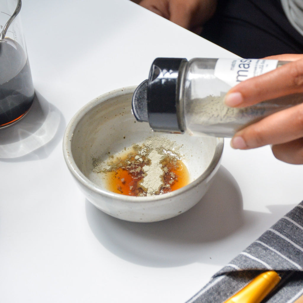 To start, shake tiny bit of mask powder onto your liquid, stirring with your bamboo spoon before adding more. Like you’re sprinkling nutmeg on a latte - a little at a time. The first few shakes may clump and stick to your spoon - which is fine - but as long as your liquid is still liquid, keep adding mask a little at a time, stirring as you go. Shake and stir! Shake and stir! Continue this process until the clay absorbs all of your liquid, leaving you with a thick mixture that would not drip if held upside-down. Small clumps are ok and normal.